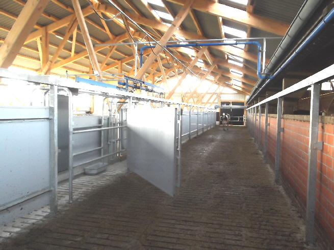 Der Kuhtreiber dient zum Vortreiben der Kühe im Vorwartehof. Er wird elektrisch angetrieben. Das Absperrgitter läßt sich hydraulisch hochschwenken.